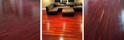 Morado hardwood flooring, also known as Brazilian Rosewood, is known first and foremost for its beauty. Its dark violet heartwood is often streaked with striking ribbons of rich chocolate browns and creamy tans. It has an interlocked grain that is sometimes wavy, sometimes straight, and a texture that ranges anywhere from very fine to quite coarse. It is so beautiful, in fact, that it used for many decorative applications, such as veneers, cabinets, and specialty items such as guitars: